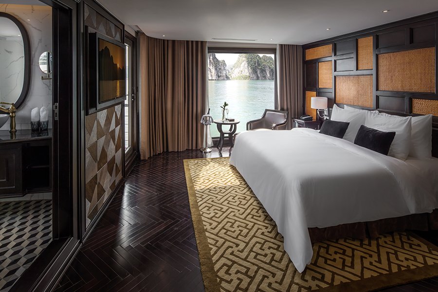 Phòng nghỉ hạng Ambassador Deluxe trên du thuyền sang trọng 6* với hải trình 2 ngày 1 đêm trên vịnh Hạ Long dành cho 2 người (thời gian check-in trước 12h30, check-out trước 10h30)