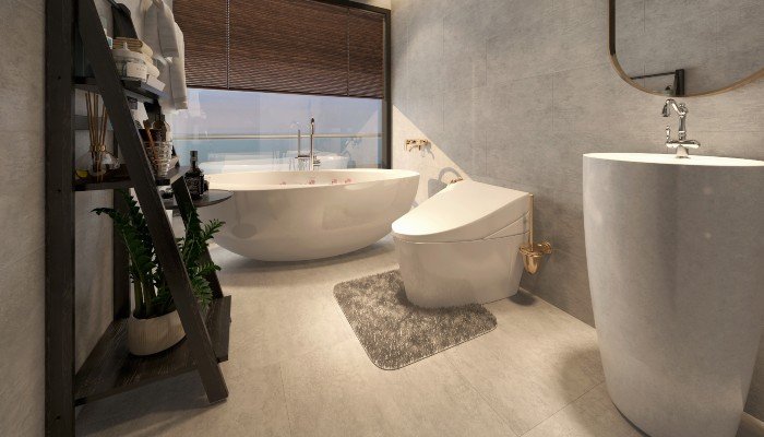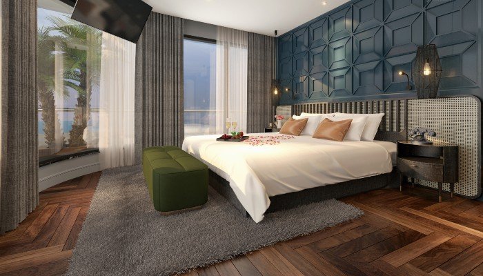 Phòng nghỉ trên du thuyền sang trọng có bồn tắm và sân tắm nắng riêng phòng.